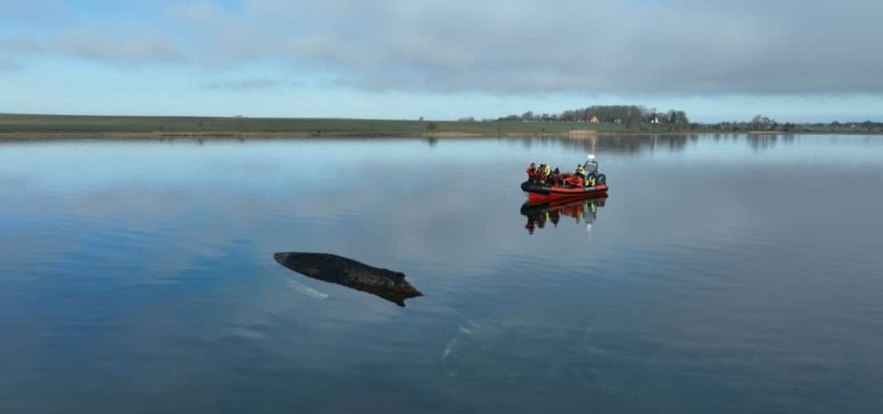 Der Wal ragt inzwischen deutlich stärker aus dem Wasser. Dadurch wird es schwieriger zu erkennen, ob er überhaupt noch atmet. Sobald der Verdacht besteht, dass die Atmung aussetzt, wird ein Tierarzt hinzugezogen. Die Lage bleibt angespannt und emotional belastend.